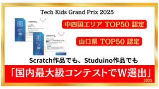 国内最大級のプログラミングコンテスト「Tech Kids Grand Prix 2025」で、Endo IT トレーニング(下関・宇部)の生徒2名が「中四国エリアTOP50」「山口県TOP50」に同時選出!ゲーム作りと防災ロボット、異なるアプローチで評価された2人の快挙と講評をご紹介します。
